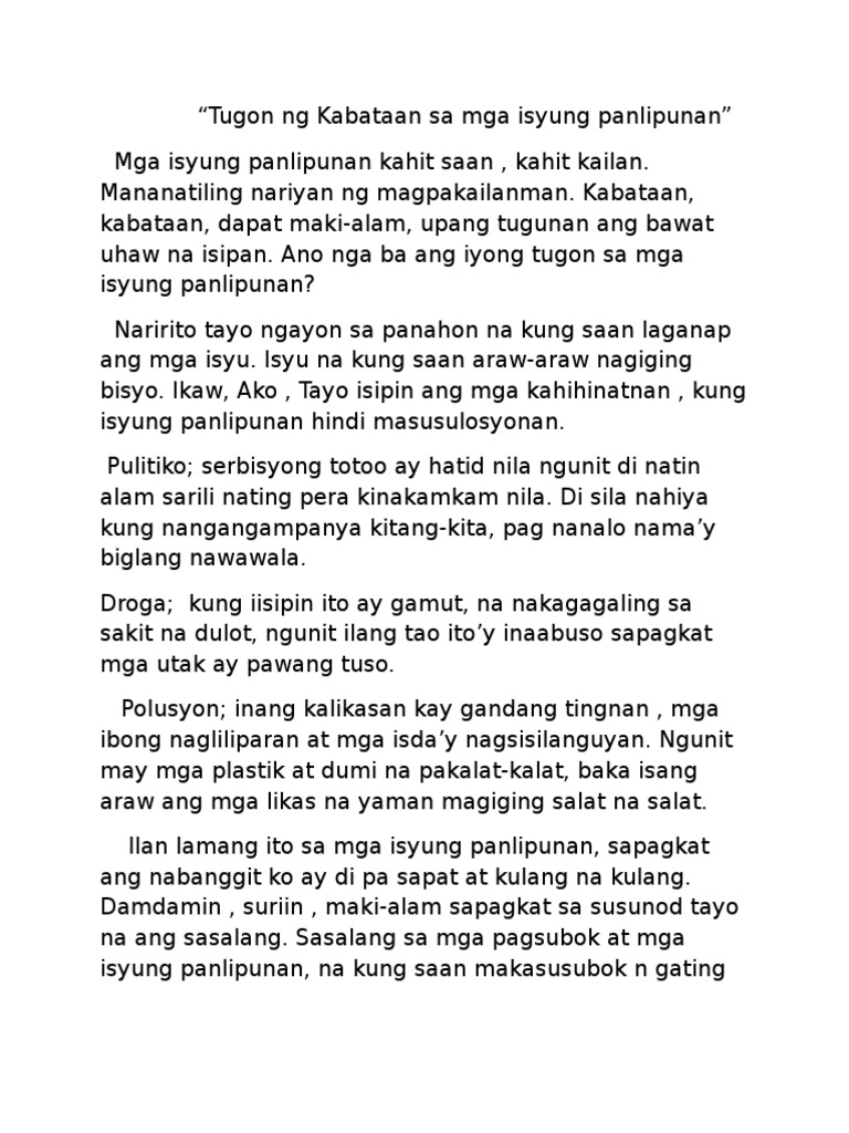 About Press Copyright Contact us Creators Advertise Developers Terms Privacy Policy Safety How YouTube works Test new features Press Copyright Contact us Creators. Ibat ibang isyu ang kinakaharap ng ating lipunan kung kayat kaming mga kabataan ay dapat na may sapat na kaalaman tungkol dito upang hindi na madagdagan ang mga isyung ito. Tugon ng mga Kabataan sa Isyu ng Lipunan Sabi nga ng karamihan kabataan ang pag-asa ng bayan pero paano ito mapapatunayan kung mismo ang ating kabataan ay nawawalan na ng pag-asa na maayos ang ating lipunan.