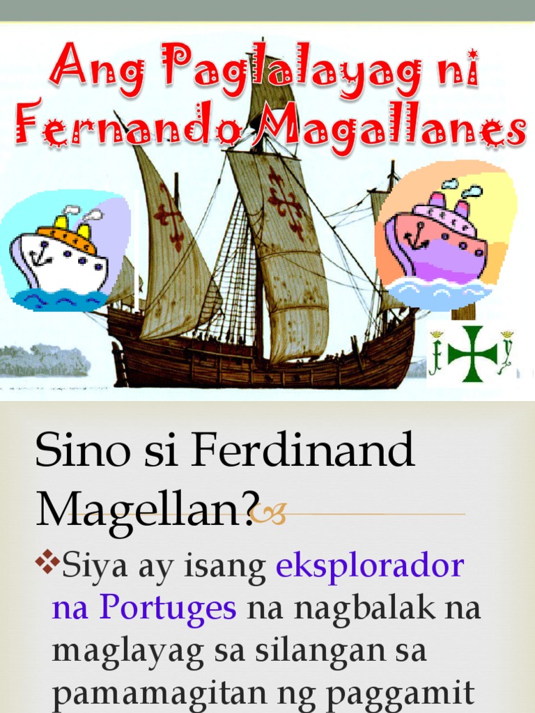 Paglalayag ni magellan sa pilipinas. Ang unang tala na pagbisita na mula sa Kanluran ay ang pagdating ni Ferdinand Magellan sa pulo ng Homonhon sa timog-silangan ng Samar noong ika-16 Marso 1521. Ang kanyang paglalayag para sa pagtuklas ay isinulat sa isaang talaan ng Italian navigator na si Antonio Pigafetta na kasama nya sa paglalayag at unang nalathala noong 1525 habang ang kabuuan ay isinapubliko noong 1800 bukod pa sa serye ng panayam sa mga. 1 Dahil sa kaniyang mga tala maaari nating buuing muli ang mundo kung saan gumalaw at.