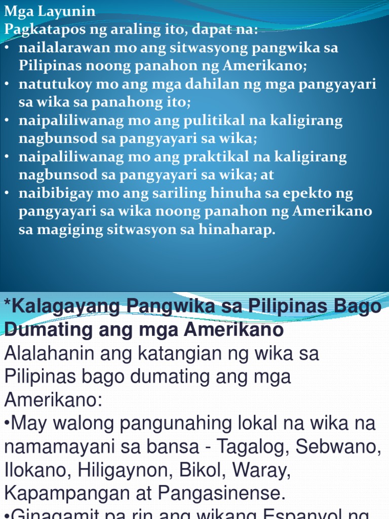 Wika sa Panahon ng Amerikano Kasaysayan ng Wikang Pambansa sa PANAHON NG MGA AMERIKANO 1. Ito rin ang naging katulong ng mga Amerikano upang mapaamo at mapasunod ang mga Pilipino Higit na binigyang halaga ang pagmamahal sa kulturang. Republic of the Philippines Department of Education Region II Cagayan Valley Schools Division of Nueva Vizcaya.
