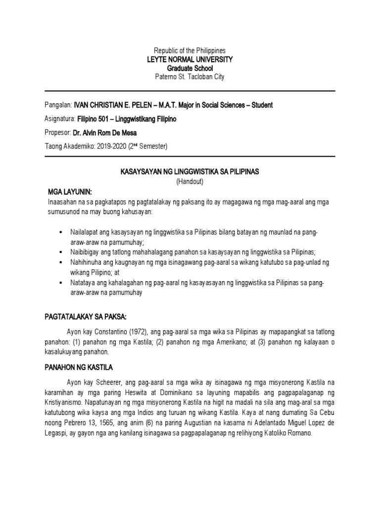 1 Kasaysayan Ng Linggwistika Sa Pilipinas Pdf